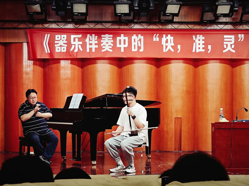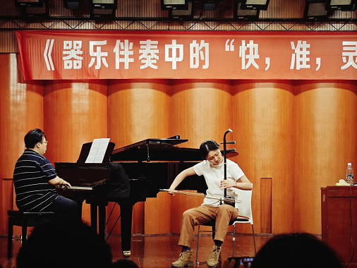 讲座进行到最后,曲大卫老师还和我系二胡学生陶李琛、张天媛,进行了现场合作演绎,并针对个别伴奏技巧、演奏心得等方面的问题,进行了讲解和示范,还与大家分享了许多有趣的音乐故事。
