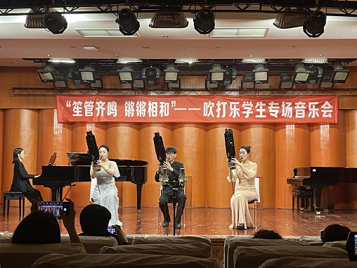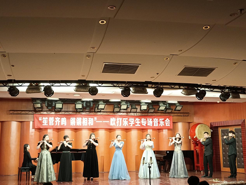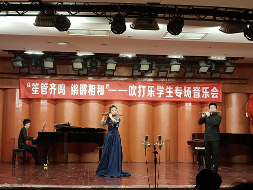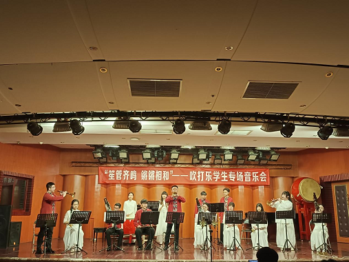 本场音乐会共展演了10首作品,涵盖了吹打教研室的竹笛、唢呐、笙及民族打击乐等所有专业,演出中同学们使用了我院独有的特色乐器十孔笛和L-36簧笙,演出形式有独奏、齐奏、重奏及吹打乐合奏等,作品体裁多样、内容丰富,充分展现了我系吹打教研室学生的演奏能力与青春风采,同学们用精湛的演奏技术,精致的舞台呈现,在舞台实践中给现场观众带来了视、听、演全方位的艺术享受。这次活动是民乐系为广大师生提供的一次非常有益的学习、观摩、实践、交流的机会,对吹打乐教研室的教学、科研及艺术实践将会起到极大的推动作用。演出结束后,同学们依然陶醉在舞台演出的兴奋之中,久久不愿离去,大家希望能够多一些舞台展示的机会,期待着下一届民乐系艺术实践周的到来。