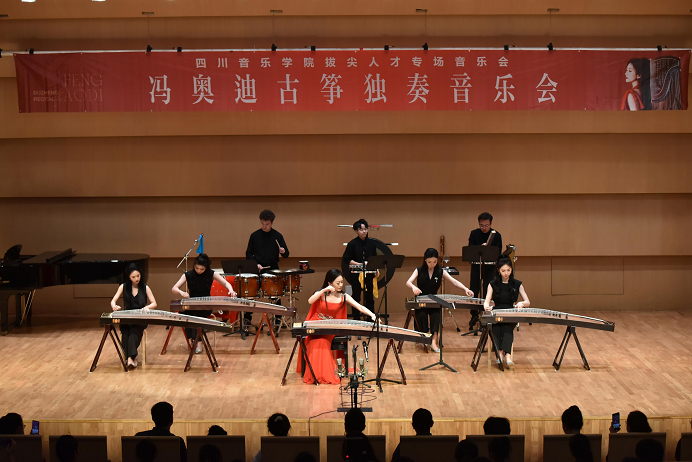 演出当晚,冯奥迪携手钢琴艺术指导范琨明、打击乐演奏家赵思智、二胡演奏家宋华丽、青年古筝演奏家吴健、望川四重奏和天籁筝乐团共同为观众带来了《吼天--致大地与歌》、《汉江韵》、《赤壁怀古》、《八面风》、《柳青娘》、《海之波澜》6首风格迥异、形式多样的古筝作品。冯奥迪与各位演奏者们的精心准备和全情投入为现场观众带来一场完美的视听盛宴。