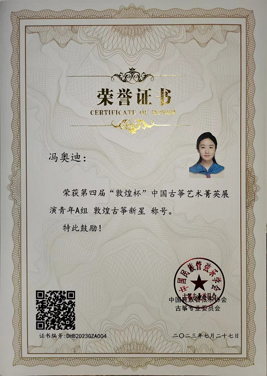 研三学生冯奥迪荣获第四届“敦煌杯”古筝艺术菁英展演职业青年A组“古筝新星”(一等奖)。该展演由中国民族管弦乐协会古筝专业委员会主办,共计380名选手入围职业组终评。本届展演涌现出一批优秀的青年古筝演奏人才,体现了近年来中国古筝在音乐院校、艺术院校、综合高校的艺术教学成果。在中国民族管弦乐学会领导的关心扶持下、在中国民族管弦乐学会古筝专业委员会及王中山会长和众多古筝界同仁的积极推动下,历经十年四届的艺术积累和完善、持续升级,在业内产生了很大社会影响力,得到行业高度评价。