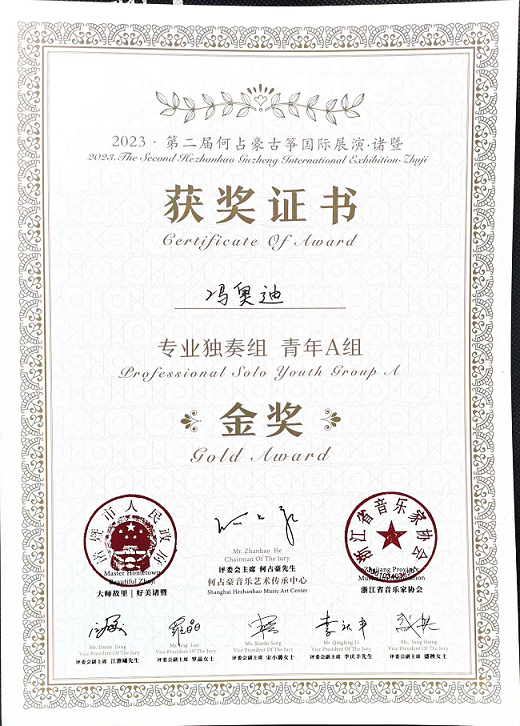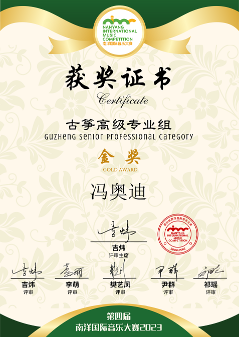 冯奥迪获得第四届南洋国际音乐大赛古筝高级专业组金奖;