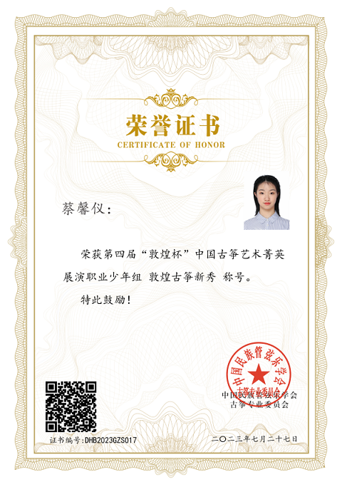1、附中高二学生蔡馨仪荣获第四届“敦煌杯”中国古筝艺术菁英展演 职业少年A组 敦煌古筝新秀(全国总决赛二等奖)。