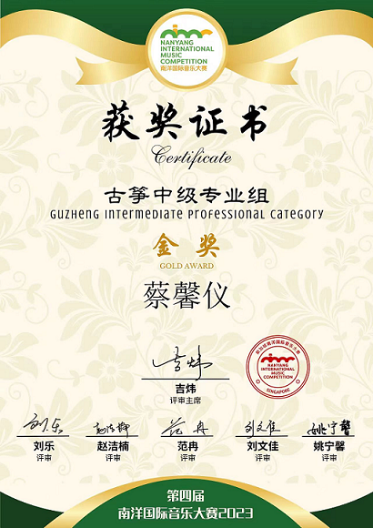 5、附中高二蔡馨仪荣获第四届南洋国际音乐节大赛2023古筝中级专业组金奖。