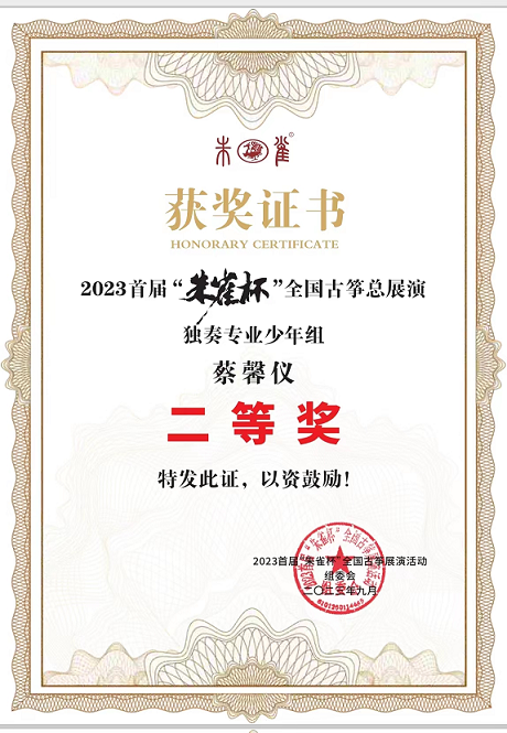 2、在首届“朱雀杯”全国古筝展演中,附中学生蔡馨仪,由于之前获得了成都赛区特等奖,及四川赛区一等奖的好成绩,被推选参加了全国总决赛,荣获专业少年组二等奖。该赛事由西安音乐学院全程指导,西安音乐学院资产公司、西安朱雀乐器有限公司共同主办,西安音乐学院民乐系、艺术实践处共同承办,西安音乐学院党委宣传统战部、共青团西安音乐学院委员会与各省级古筝专业委员会共同支持。旨在弘扬民族艺术文化,促进古筝演奏、教学与实践水平的全面提升。由来自全国二十个分赛区一万余名选手经过推选出201名选手参加了总展演,最终共评选出60名获奖选手及获奖组合。其中获得各组别一等奖选手各1名;各组别二等奖选手各1—2名;各组别三等奖选手各3—5名。