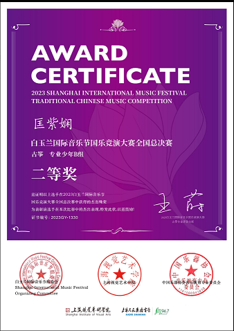 附中初三匡紫娴 荣获艺术初中组 古筝个人单项金奖