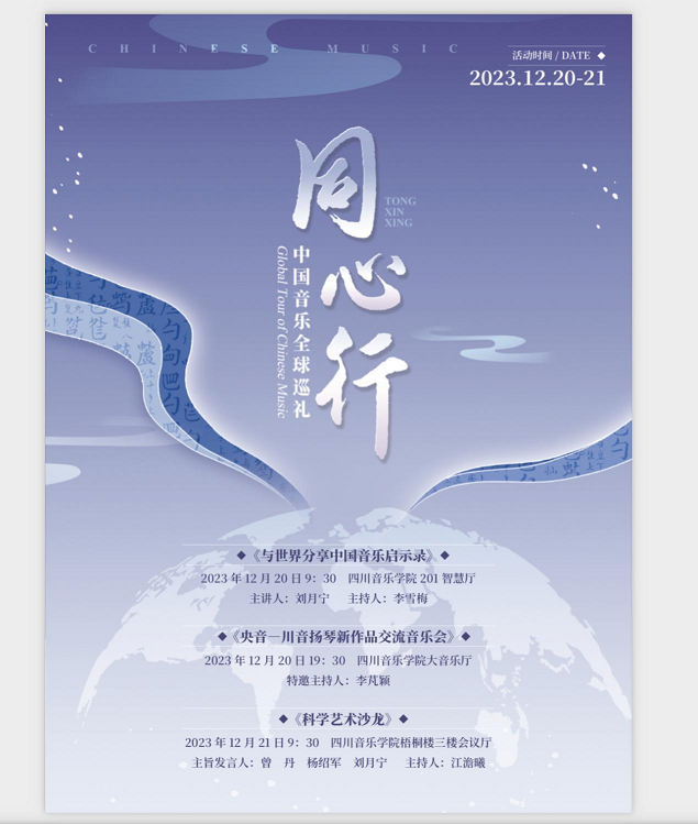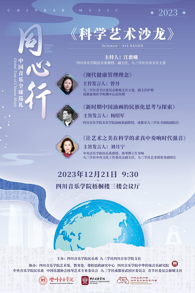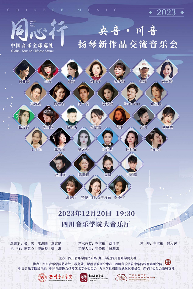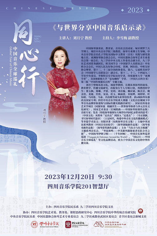 2023年12月20日至21日,伟德bv国际体育民乐系、九三学社伟德bv国际体育支社主办,由中央音乐学院民乐系扬琴教授、博士生导师、九三学社中央委员刘月宁老师主导的“同心行——中国音乐全球巡礼”活动在伟德bv国际体育成功举行。此次巡讲巡演系列活动丰富多样,包括学术讲座、扬琴新作品交流音乐会暨科学艺术沙龙研讨会。