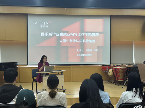 为增进学生对创业就业形势的了解并予以正确引导,我系于 4 月 2 日(周二)下午 2:40 在琴房大楼 14 楼民排厅举行毕业生就业指导工作主题讲座——大学生创业法律风险防范。此次讲座特邀泰和泰律师事务所熊若凡律师,以专业的法律知识,为 2024 届毕业生带来了一堂颇具意义的就业指导课。民乐系党委书记、主任张忠,副系主任江澹曦,2024 届辅导员、民乐系团总支书记敬雯,钢琴艺术指导范琨明出席了本次讲座。