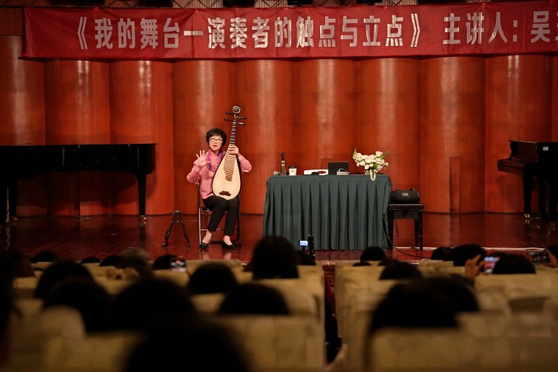 本场讲座主讲人系中国著名琵琶艺术家、中国艺术研究院博士研究生导师、中国民族管弦乐学会会长、中国音乐家协会琵琶学会会长吴玉霞教授。在讲座中,吴玉霞教授分享了自己50多年的从艺经历,强调了“勤能补拙”四字的重要性。她从乐曲探析、技法特点、审美艺术、传承创新等方面,探讨了器乐演奏从技术储备到舞台呈现之间的规律性与实践性,将自身长期艺术实践所获得的经验和感悟进行了归纳和总结。吴玉霞教授指出,应当把礼仪文化、声音美学、表演心理和突发事件贯穿到平日的表演实践中,从中提升智慧。并以大量生动有趣的网络热门视频、案例分析和精细的作品解读,立体丰富地为观众们呈现了自己的审美表达与艺术理念。
