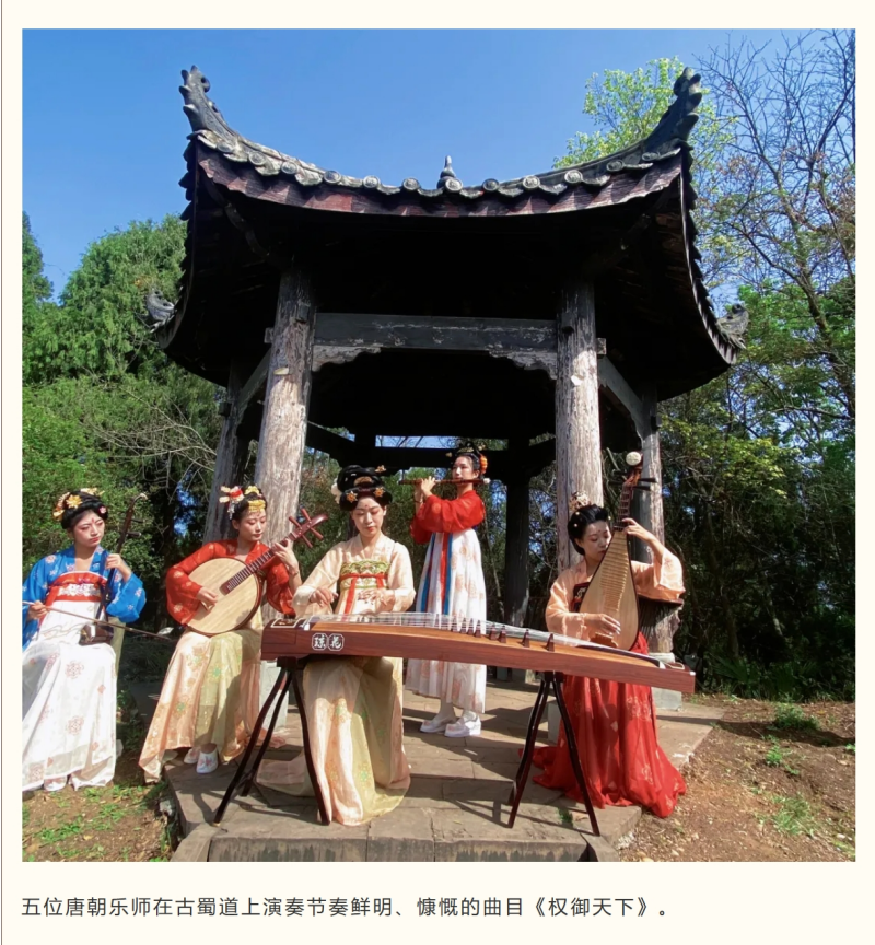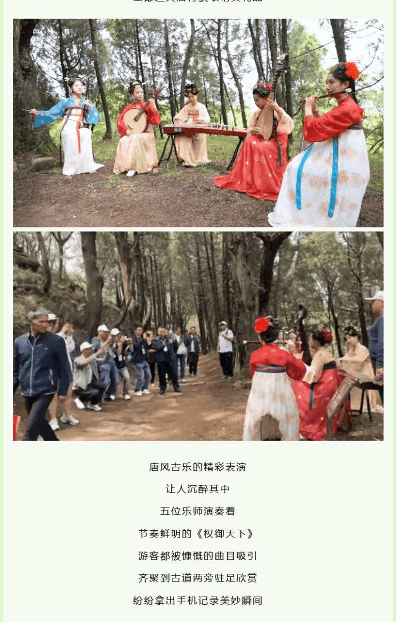 本次活动邀请了民乐系“玲珑新国风乐团”进行现场演出。乐团由民乐系钢琴艺术指导教师马霄汉担任艺术指导,中央音乐学院琵琶研究生匡泓霖、民乐系2022级研究生俞明辰负责策划和改编,团队成员包括2020级马樱桐、朱忠兰、毕加杞,以及2022级祁悦、胡勤怡。他们在活动现场精彩演奏了《市集》、《权御天下》等曲目,吸引了来自世界各地的登山户外运动专家、徒步爱好者、汉文化爱好者和游客参与,现场对其乐团专业的演奏反响强烈,气氛热烈。同时中央电视台、四川卫视、四川广播电台、昭化文旅、网易新闻、四川新闻、人民网四川频道等多家媒体对此进行了报道。
