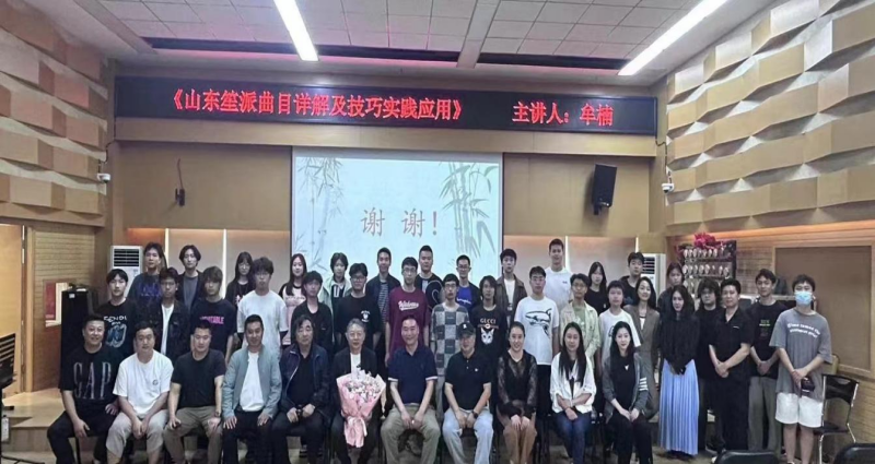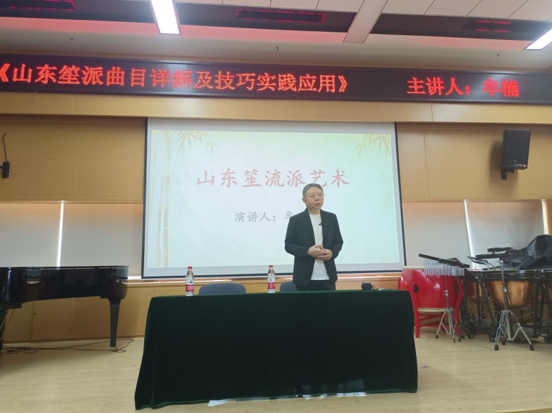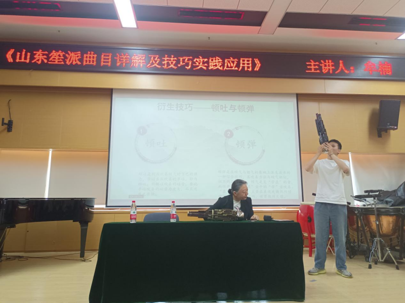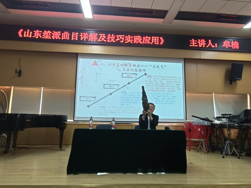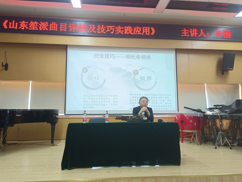牟楠副教授重点讲解了山东笙派重要演奏技术“三大气”,即顿气、锯气、剁气及其衍生技巧,同时结合山东笙派的代表曲目《微山湖船歌》、《挂红灯》、《骑竹马》等乐曲进行示范演奏讲解,并为我系笙专业学生亲自指导乐曲。牟楠老师的讲解声情并茂,幽默风趣,随时有强烈的意境感和画面感,他演奏的37簧传统笙音色纯净、优美,他的演奏技术精湛,干净利索,轻松自然,惟妙惟肖,现场气氛高涨,掌声不断。来自民乐系吹打教研室的老师和同学们观看了本场讲座,伴随着牟楠老师演奏《骑竹马》,本场讲座在热烈的掌声中圆满结束。本次讲座不仅增加了我系师生对山东笙派风格的理解和学习兴趣,也激发了大家对传承传播中华民族传统文化的责任感和使命感。