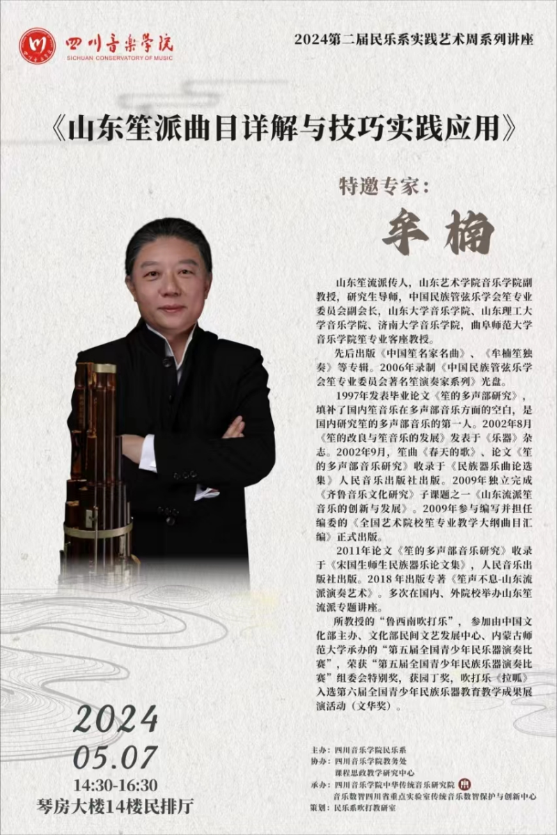 2024 年5月7日下午,由伟德bv国际体育民乐系主办的“第二届实践艺术周系列讲座”之“吹打乐专家讲座”《山东笙派曲目详解与技巧实践应用》,在四川⾳乐学院琴房大楼14楼民排厅成功举办。