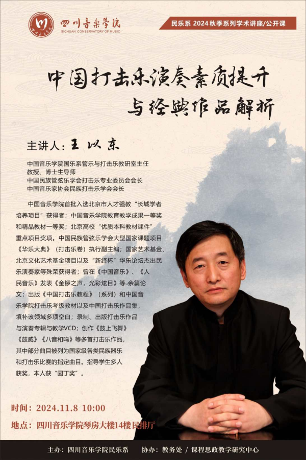 2024年11月8日,伟德bv国际体育民乐系2024秋季系列学术讲座/公开课,在学院琴房大楼民排厅进行。本次讲座邀请到了中国音乐学院国乐系管打教研室主任,博士生导师,中国民族管弦乐学会打击乐专业委员会会长,中国音乐家协会民族打击乐学会会长,著名打击乐演奏家、作曲家、教育家王以东教授。