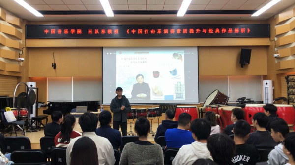 8日上午10:00,在民乐系党委书记、主任张忠教授的主持下,王以东教授以《中国打击乐演奏素质提升与经典作品解析》为题,从中国打击乐的历史发展,对中国打击乐专业进行全面而深刻的阐述。尤其对中国打击乐的基础训练,演奏风格和演奏技术特点做了细致的介绍,并对演奏素质提升以及经典作品做了深入分析和总结。