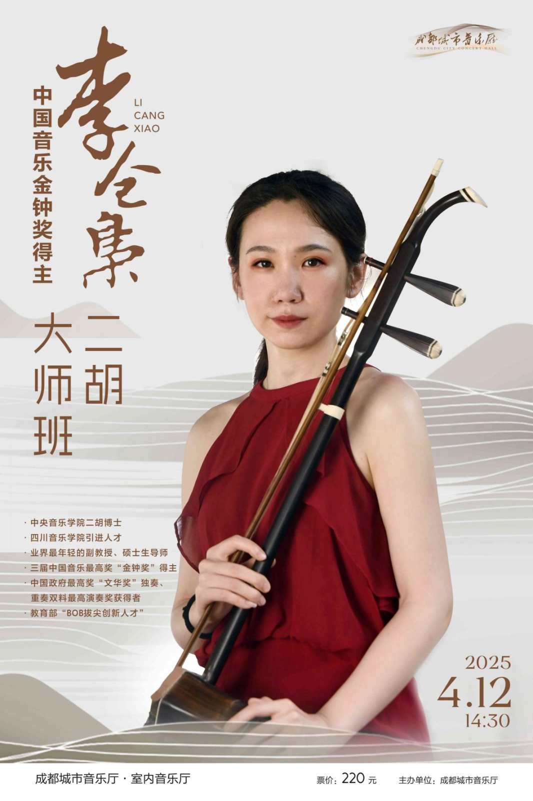 民乐系李仓枭副教授二胡大师班将于2025年4月12日下午2点30分于成都城市音乐厅室内音乐厅举行