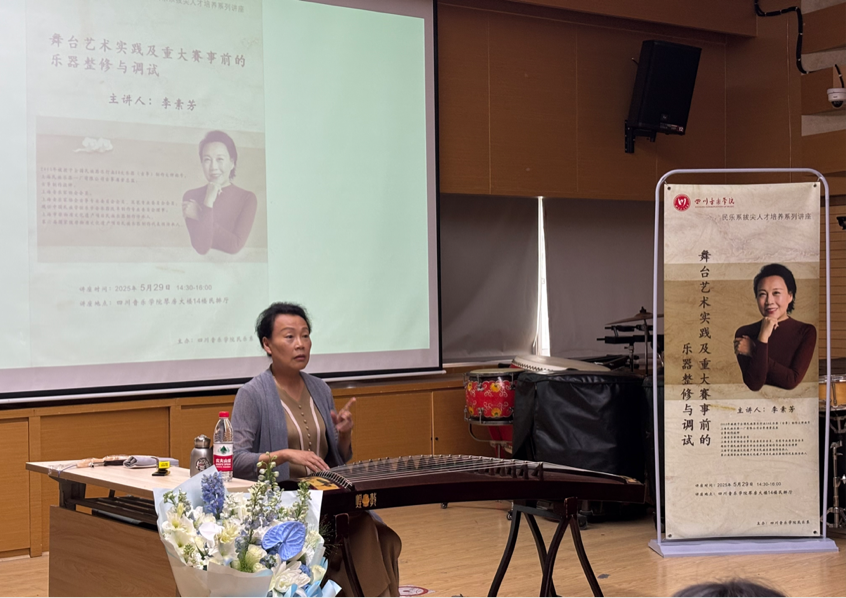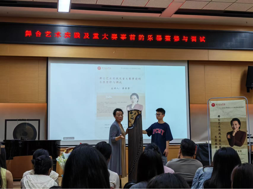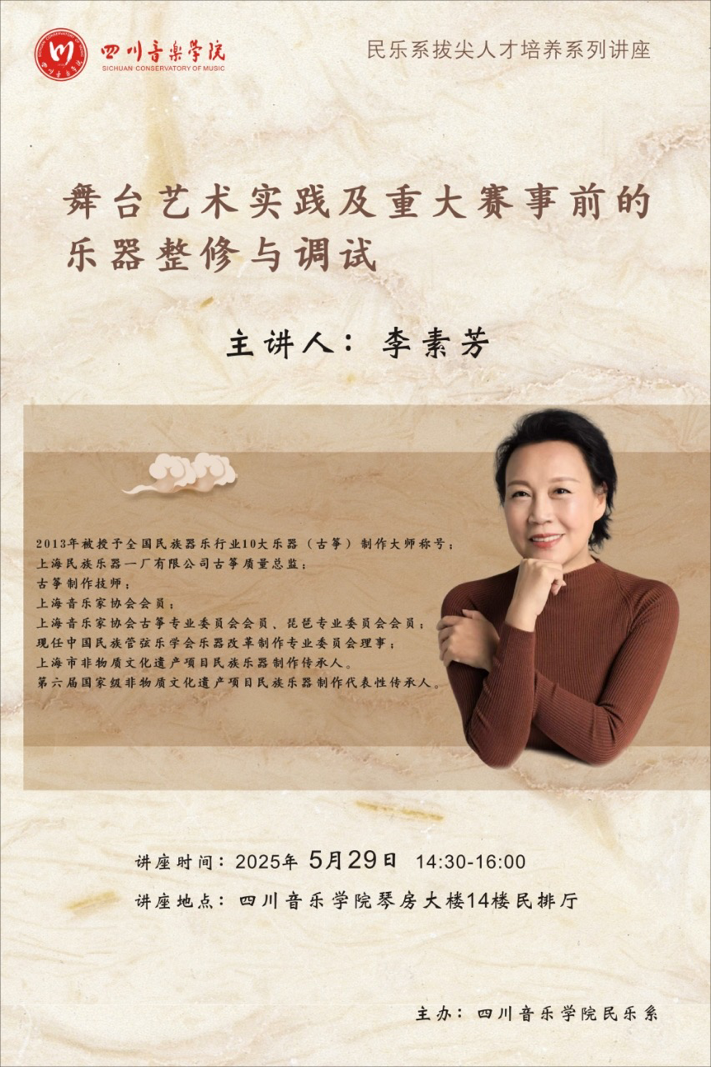 2025年5月29日下午14:30,伟德bv国际体育民乐系拔尖人才培养系列讲座“舞台艺术实践及重大赛事前的乐器整修与调试”在民排厅如期举行,本场讲座邀请到上海民族乐器一厂有限公司古筝质量总监、中国民族管弦乐学会乐器改革制作专业委员会理事、第六届国家级非物质文化遗产项目民族乐器制作代表性传承人李素芳作为主讲人,围绕古筝的调试、保养、使用技巧等方面问题为民乐系师生们进行了交流与分享。