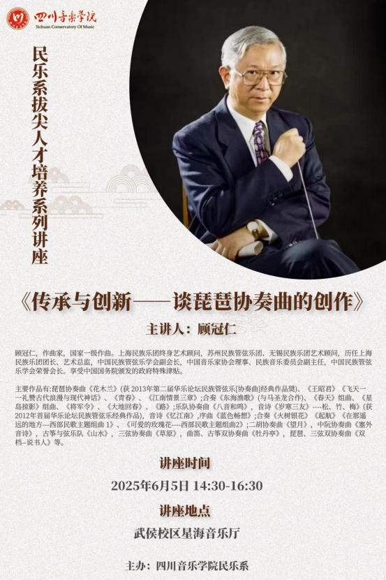 2025年6月5日14:30,伟德bv国际体育民乐系拔尖人才培养系列讲座“传承与创新—谈琵琶协奏曲的创作 ”在星海音乐厅如期举行,本场讲座邀请到了作曲家,国家一级作曲,上海民族乐团终身艺术顾问,苏州民族管弦乐团,无锡民族乐团艺术顾问,历任上海民族乐团团长、艺术总监,中国民族管弦乐学会副会长,中国音乐家协会理事、民族音乐委员会副主任,中国民族管弦乐学会荣誉会长顾冠仁先生作为主讲人。民乐系党委书记、主任张忠,副主任江澹曦,弹拨教研室副主任李雪梅,重合奏教研室主任林怡及众多民乐系教师参加了此次讲座,讲座由林怡老师主持。