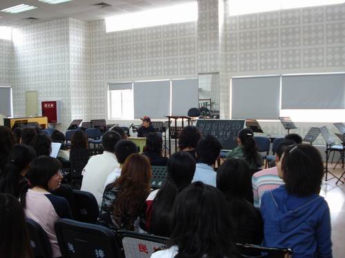 由于观察到学生在乐队排练中出现视奏较慢,节奏不够准确等问题,为使上述问题得到一定程度的缓解,民乐系中阮教师沈飞于2008年3月28日12:45—14:15,在民排厅作了“关于节奏准确性”的讲座。大约50位同学和老师参加。   讲座分几个部分:1、为基本节奏型的解析与实用。(如前16、后16、切分音、符点的组合与变化组合。)2、休止符的解析与实用。3、连线的应用。4连音的应用。主要是三连音和五连音、六连音、七连音以及加上休止符、符点、连线的变化组合,并与前面内容再组合。5、常用拍号的解析与实用。如1/4、2/4、3/4、4/4、4/5、3/8、5/8、6/8、7/8、9/8、12/8等,每一项内容都在讲解后列举实例。为使大家在理解理论后真正能用于实践,故不做示范,先由个别同学尝试完成,经点评、准确后,再带领大家共同完成谱例。现场气氛较为活跃,同学们学习的热情也比较高,绝大部分同学要求再往下讲一课。   经本次讲座,沈飞教师也吸取了经验,也愿意积极、认真、严肃、严谨的态度准备下一次讲座,使同学们真正受益。
