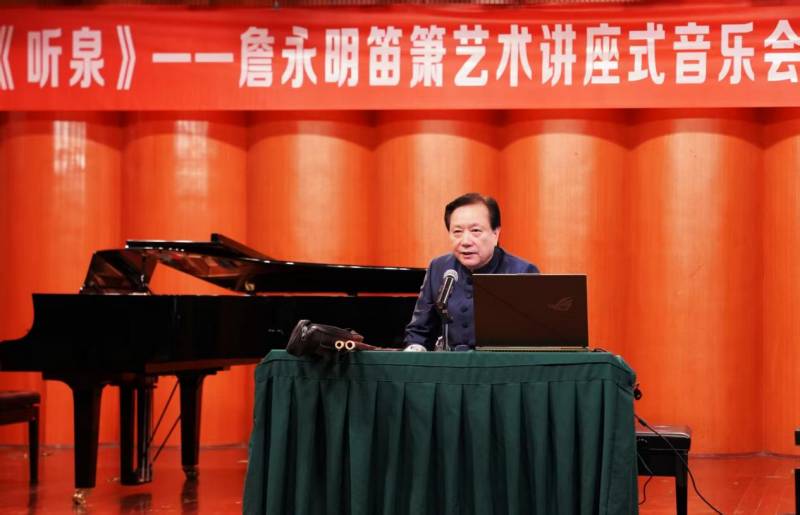 上午9时,著名笛子演奏家、教育家詹永明教授登台开讲。他以“历史脉络—技法创新—流派传承”为主线,结合《幽兰逢春》《鹧鸪飞》《兰花花》《听泉》等经典曲目,解析如何以现代音乐语言诠释竹笛艺术内涵,展现其跨越时代的艺术魅力。