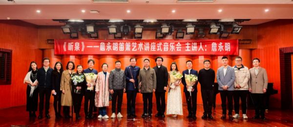 音乐会现场,詹永明特邀三位青年演奏家同台演绎。上海音乐学院在读博士郭虹希带来《楚颂》,以竹笛与钢琴的对话再现“霸王别姬”的悲壮史诗;成都市青年笛箫演奏家刘胜演奏移植曲《古意长安》,勾勒出盛唐长安的烟火与苍凉;上海音乐学院在读博士卢耀波则通过作品《祁连音画—乌岭》,用苍凉的旋律勾勒出边关古道的壮阔。詹永明教授还为大家完整演奏了名曲《听泉》,将现场气氛推向高潮。最后,他与学生合奏《西湖春晓》,以细腻温柔的笛声描绘白居易笔下的江南春色。
