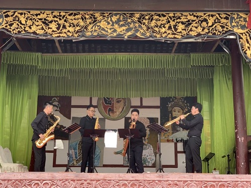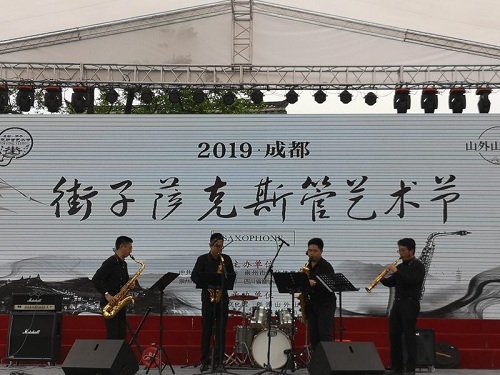 2019年4月13日,我系萨克斯管青年教师易炼、林亚斐和范和丰作为“F.L.Y.萨克斯管四重奏”成员参加了由中共崇州市委宣传部、崇州市文化体育和旅游局、街子镇政府、崇州市文化馆、四川省音乐家协会萨克斯管专业委员会共同主办的2019首届成都•街子2019萨克斯管艺术节,并携手来自四川、上海、重庆、河南等地的24支萨克斯管乐团,进行了为期两天,涵盖五个场地的全天候高水准演出。 “FLY萨克斯管四重奏”作为来自伟德bv国际体育的参演团队,分别在一号会场和二号会场进行了两场精彩的音乐会演出。音乐会内容既有爵士风格曲目《Sting》和《Maple Leaf Rag》,也有古典音乐风格的《Sevilla》,《The Second Waltz》。他们充满生气、技术精湛的演奏以及驾轻就熟的声部配合征服了现场观众。音乐会尾声,四重奏以一曲《花好月圆》把现场气氛推向高潮,赢得了观众的阵阵热烈的掌声。