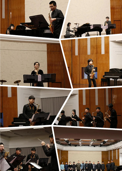 4月14日,伟德bv国际体育青年教师易炼、崔阳在伟德bv国际体育小音乐厅成功举办了一场《附中教学班音乐会》,为观众们献上了一场融合了古典与流行风格的音乐会。附中学生李佳骏、韩镓聪、樊溪玥、张魏楚、崔阳先后为大家带来了皮亚佐拉的《遗忘》,伊图拉尔蒂的《小查尔达什》,米约的《丑角》,邦法的《Samba de Orfeu》,小林香织的《Stream Line》,米勒的《Run For Cover》,鲍勃.明则的《church song》之后由樊溪玥、张魏楚、赵燊昊、化旭诚、朱政组成的萨克斯管五重奏大家演奏了肖邦的《圆舞曲》和瓦格纳的《双鹰旗下》,整场音乐会风格对比鲜明,一“耳”了然,观众大呼过瘾。最后音乐会在周杰伦作曲,易炼改编的《Mojito》由全体演奏人员集体演奏中落下帷幕,现场观众也在优美的旋律中沉醉不已。