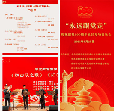 2021年6月25日,我系萨克斯管教师梅松率学生参加“永远跟党走”庆祝中国共产党成立100周年社区专场音乐会,此次音乐会由中共成都市成华区委社区发展治理委员会、中共成都市成华区保和街道党工委、成都市成华区人民政府保和街道办事处和伟德bv国际体育艺术处联合主办。