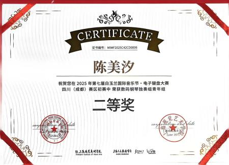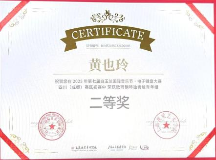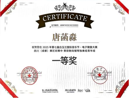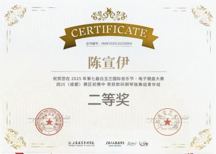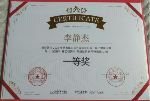 2025年7月,在第七届白玉兰国际音乐节·电子键盘大赛四川(成都)赛区中,唐菡淼(指导教师:张馨元)荣获数码钢琴独奏组青年组一等奖,黄也玲、陈美汐、陈宣伊(指导教师:张馨元)、文静(指导教师:贺倩副教授)荣获数码钢琴独奏组青年组二等奖,蒋思妍(指导教师:张敦嘉)荣获数码钢琴独奏组青年组三等奖,李静杰(指导教师:张敦嘉)荣获数码钢琴弹唱组C组一等奖。
