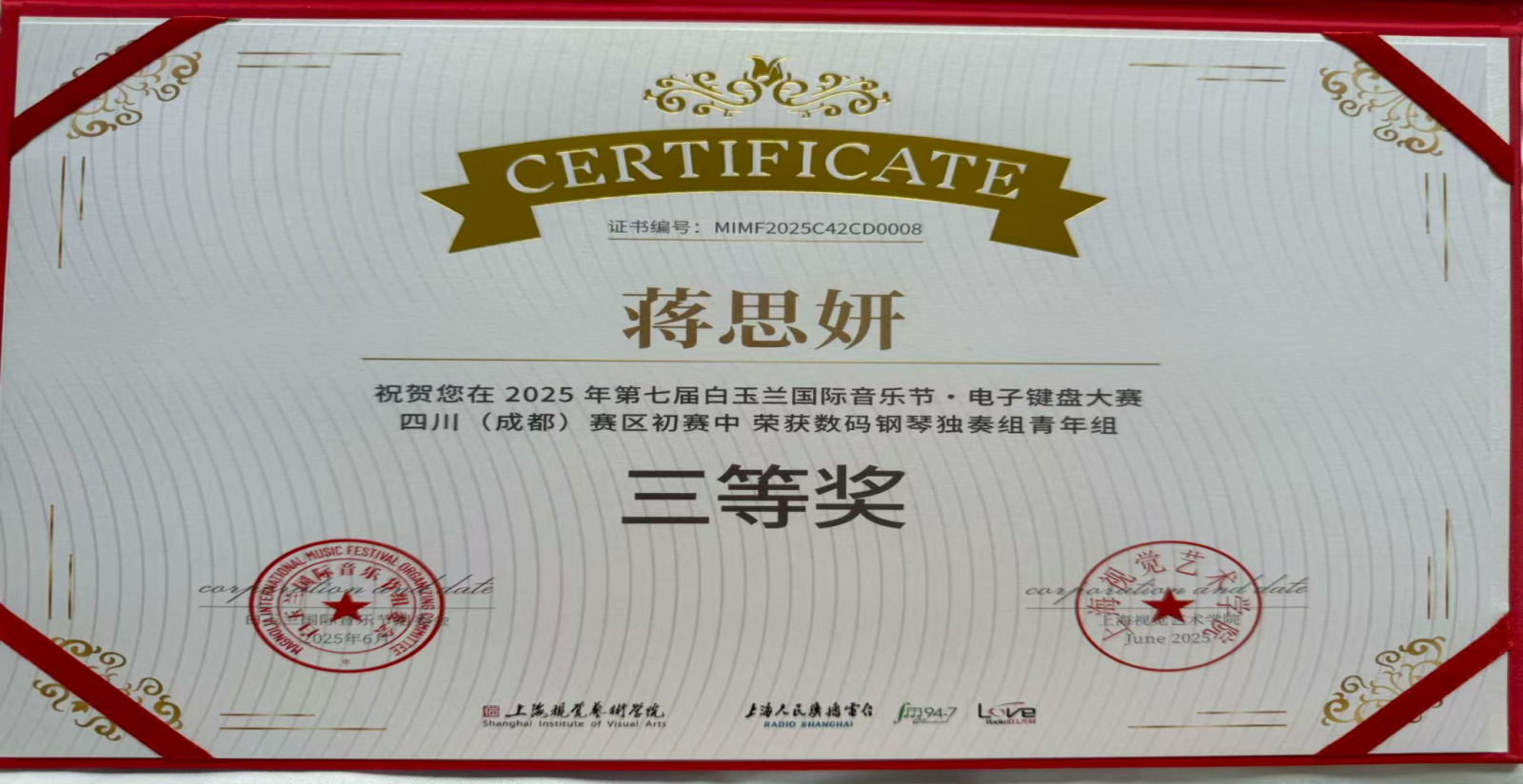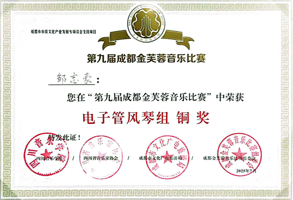 在2025年7月举办的第九届成都金芙蓉音乐比赛中,我系学生共荣获7项奖项。其中,江韵秋(指导教师:张晓波教授)、夏米妮(指导教师:吴琼教授)获专业组银奖;邹志豪(指导教师:王茜副教授)获专业组铜奖。此外,还获得青少年展演组一等奖1项、二等奖1项、三等奖2项。