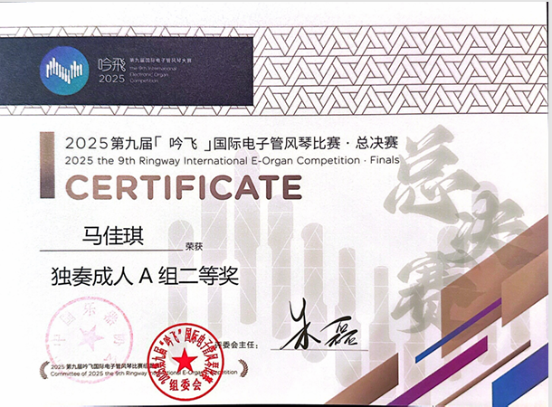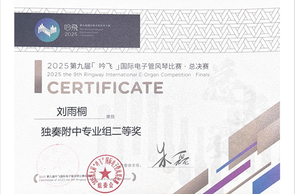 同期举办的2025第九届“吟飞”国际电子管风琴全国总决赛中,我系学生马佳琪、刘雨桐(指导教师:王茜副教授)分获二等奖,另还有六名学生获三等奖。