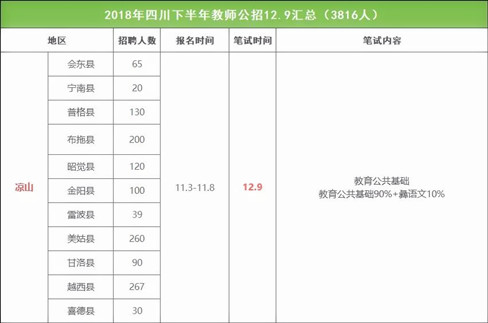 为认真贯彻落实《中共四川省委办公厅 四川省人民政府办公厅关于精准施策综合帮扶凉山州全面打赢脱贫攻坚战的意见》文件精神,加快推进“凉山州贫困县义务教育教师保障工程”工作,我州11个县面向社会公开考试招聘中小学教师1321名。其中:会东县65名,宁南县20名,普格县130名,布拖县200名,昭觉县120名,金阳县100名,雷波县39名、美姑县260名、甘洛县90名、越西县267名,喜德县30名。参加本次教师招聘的考生只能选其中一个单位的一个岗位进行报名。网络报名时间:2018年11月3日—11月8日24:00时;选择加试彝语文或必须加试彝语文的岗位还须进行现场报名,现场报名时间详见各县公告。教育公共科目笔试时间:2018年12月9日。