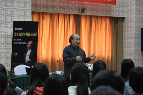 2012年4月10日,应歌剧与合唱系之邀,我国著名指挥家李西林教授在琴房大楼多功能厅为我系师生开了一堂题为《合唱专业在学习中的若干问题》学术专题讲座,出席本次讲座的有我系系主任张莉教授、刁锡强书记以及我系全体师生。本次讲座是一次我系的内部讲座,但还是有很多省内外其他院系的老师和学生以及一些合唱及指挥爱好者慕名前来。整个讲座会场座无虚席,过道都有站立听讲者。 这是一堂别开生面、生动风趣的专题讲座,李西林教授用自己幽默风趣的比喻,深入浅出地给我系师生讲述了合唱的起源、合唱现状以及合唱未来的发展。同时,还现场排练我系合唱专业学生演唱《掀起你的盖头来》和《怒吼吧,黄河!》等合唱作品片段,直观而形象地讲授了合唱中正确的声音定位。李西林教授反复强调专业院校的合唱学习应建立正确的声音概念,专业合唱学习应以美声唱法为基础,合唱是建立在独唱基础上的立体的多色彩的更丰富的艺术表现形式等等。在李西林教授对理论知识独到的解读以及在他丰富的肢体语言带动下,全场师生及来宾在欢歌笑语中度过了两个半小时。