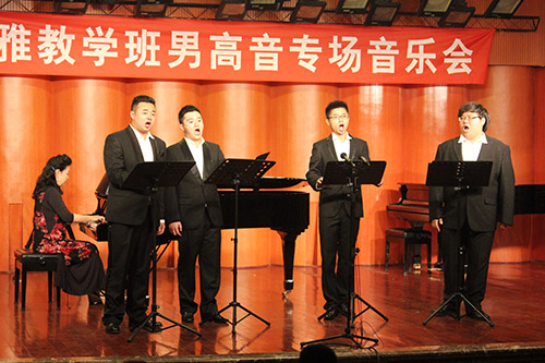 2013年6月19日晚7点30分,唐竹雅教学班男高音专场音乐会在伟德bv国际体育聂耳音乐厅成功举行。音乐厅内气氛热烈,座无虚席。歌剧合唱系的很多专业老师也莅临本场音乐会。    本次音乐会由声乐一系4名本科学生参加,他们通过独唱及重唱的形式,很好的展现了男高音的演唱特点。担任音乐会钢琴伴奏的是声乐一系的郭永厚教授,音乐会在轻松愉快的气氛中进行,学生们顺利的完成了本次舞台实践活动,并丰富了自己的舞台经验。   唐竹雅老师对学生们音乐会顺利结束表示祝贺,给予了学生们极大的鼓励,同时提出了更高的要求。希望学生们继续努力,在声乐道路上走得更高、走的更远!