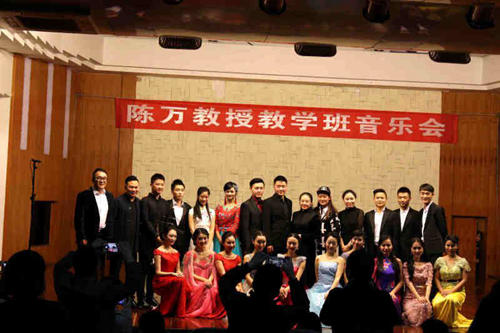 2015年11月17日晚七点半,“陈万教授教学班音乐会”在川音小音乐厅成功举行。陈万教授带领“陈家班”各位同学为大家带来了一场精彩的演出。     当晚,小音乐厅全场座无虚席,甚至过道里都站满了观众。     音乐会开场,陈家班的十朵金花为大家演唱了陈老师创作的合唱曲《鸟语花香》,这首歌描写了丰收季节时鸟语花香和人们收获喜悦时的场景,她们百灵鸟般歌声回荡在音乐厅中。朱荟钱演唱的《春天的芭蕾》掀起了高潮,无论是唱功还是情感的处理都深受好评。最后,男生小合唱《天边》《马车夫之恋》《太阳出来喜洋洋》给大家带来了不一样的音乐体验。在他们激情和欢快的歌声中,本次音乐会圆满结束。     陈万教授担任了本次音乐会的主持,他希望由他自己来介绍这些他最了解的徒弟们!陈老师幽默风趣的主持风格让整个音乐会变的轻松愉悦。     音乐会结束后,很多同学都给予了很高的评价。他们都非常喜欢陈家班的这种音乐氛围。有同学说印象最深刻的是陈老师的一句话:他希望音乐带给大家的是开心和愉快,而不仅仅是唱功和方法。
