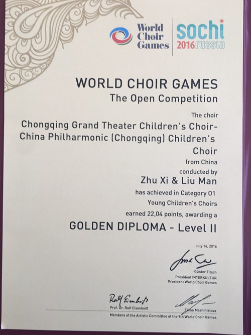 7月16日俄罗斯索契结束的第九届世界合唱节上,歌剧合唱系朱曦老师指挥重庆大剧院爱乐童声合唱团获01组金奖第二名。世界合唱节是世界上规模最大、规格最高、水平最高的合唱比赛之一,每两年一届,被誉为合唱界的“奥林匹克”,第九届世界合唱节是由国际文化交流基金会和俄罗斯联邦政府联合主办,共有76个国家和地区的283支合唱团、近1.2万名合唱队员参赛。 7月31日,在中国北京第十三届中国国际合唱节上,朱曦老师带领四川省音协爱乐女子合唱团再次获得金奖,本组别第一名,并被评为A级合唱团。   中国国际合唱节(China International Chorus Festival 简称CICF)创办于1992年,是经中华人民共和国国务院批准,目前中国境内唯一的国家级、国际性合唱类艺术活动。中国国际合唱节是我国举办的规模最大、规格最高的国际合唱艺术盛会,合唱节每两年举办一届,至今已成功举办十二届。由来自全球44个国家和地区的238支合唱团分20个组别进行的204场合唱活动。