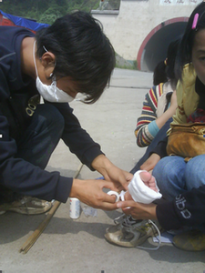 我系05级学生党员骆泽伟,5月14日上午9:00随市团委从成都—都江堰;中午1:00从都江堰步行出发背着灾区急需用的药品、食物于凌晨12:00到达汶川县;15日,到达映秀镇,来到重灾区搬运、发放救灾物资、疏散灾民;16日—17日,到达水磨镇疏散、安置灾民(在灾区连续坚持7天,19日中午返校)。