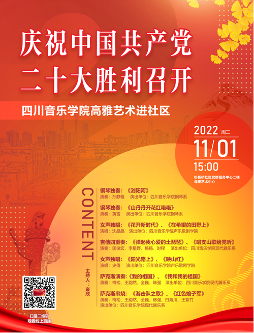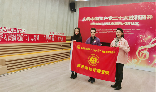 为庆祝党的二十大顺利召开,全面学习党的二十大精神,深入贯彻习近平总书记“以美育人、以文化育人”的指示精神,落实省委、省政府加快建设文化强省的各项决策部署,坚定文化自信,不断优化我省文艺创作工作格局,营造有利于文艺创作繁荣发展的浓厚社会氛围,推进全国人民典范城市创建,声乐歌剧学院“川小音”党员志愿服务队于11月1日下午三点,与钢琴系、现代器乐系联合承办了在杉板桥社区美育中心举办的“伟德bv国际体育高雅艺术进社区”文艺活动,在杉板桥社区党群服务中心二楼邻里艺术中心顺利举行。