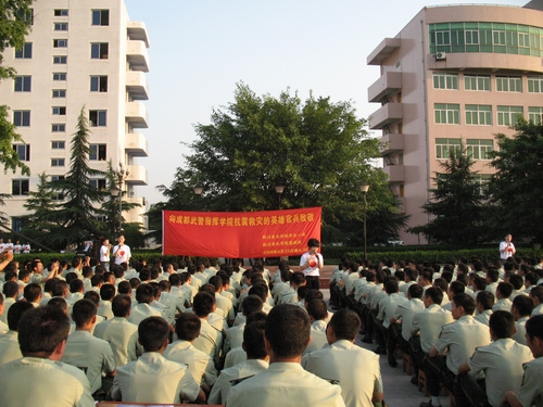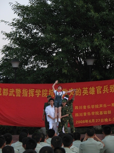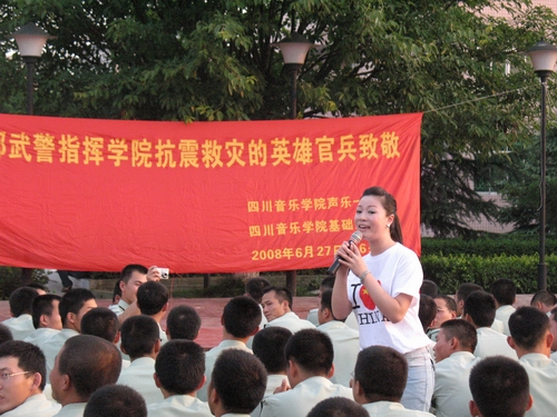 6月27日晚上7:00,在系领导的精心组织下带领54名教师及学生到成都武警指挥学院慰问奋战在抗震救灾一线的全体武警官兵。此次演出获得圆满成功。