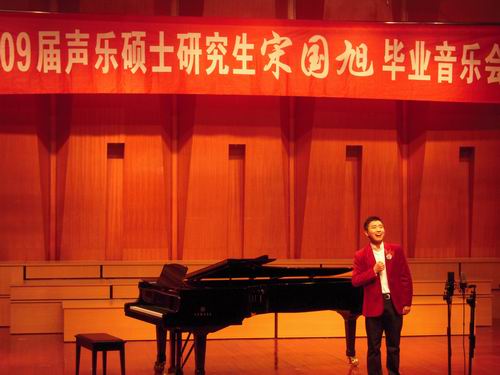 5月7日晚8:00,我系09届声乐硕士研究生宋国旭毕业音乐会在我院大音乐厅隆重举行。音乐会上无虚席。 音乐会上,宋国旭同学不仅演唱了多首不同风格的民族歌曲,其中包括山西民歌、蒙古民歌、新疆民歌及原生态歌曲等,还采用除钢琴伴奏以外的多种伴奏形式,如:古琴、箫、马头琴、民族乐队。音乐会上,一首《感谢你》深深打动在场的每位观众,整场音乐会一直掌声不断,最后以一首欢快轻松的《黄杨扁担》结束。