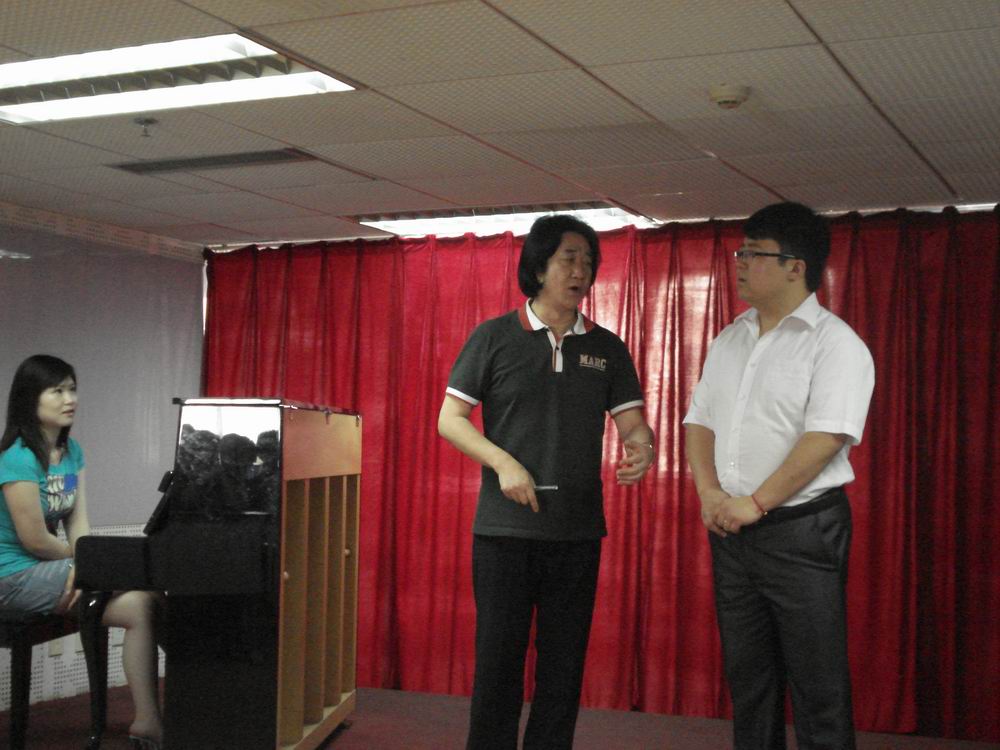 由教育部邀请,澳门教育暨青年局组织的澳门中、小学表演艺术教师一行来川访问。5月19日上午,代表团一行二十余人来我院进行教学观摩考察活动,并在琴房大楼九楼大教室悉心聆听了姜代康教授的精彩学术讲座。讲座上姜代康教授让其三个学生康彦龙、田文静、王惠分别示范演唱了《走西口》、《八月十五月儿明》以及《春江花月夜》。学生演唱前姜教授对其作品作了精辟的分析和讲解,三首不同风格的民族作品《走西口》表达了陕北情哥送情妹远行依依不舍之情;《八月十五月儿明》表达了雷锋在革命年代给士兵送月饼助人为乐的精神;《春江花月夜》是通过一首民族器乐曲琵琶曲《夕阳箫鼓》改编的,表达原是柳尧章根据传统改编并易名的一首乐曲,乐曲表现夕阳西下时人们在箫鼓伴奏下轻歌曼舞和摇归舟的动人景象。通过姜教授的生动讲解让听众明白歌曲的内在含义和内容。演唱的过程中不时的对作品作深入浅出的分析和传神的示范演唱。让演唱者和在场的听众心领神会。通过姜代康教授对歌曲的精心指导,学生每演唱完一首歌,听众都抱以热烈的掌声。讲座结束后所有师生和来宾朋友合影留念。