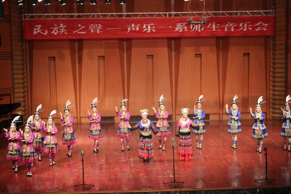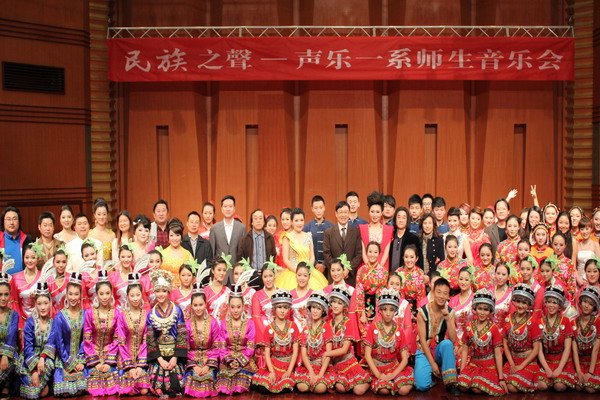 11月21日晚7:30分,“为祖国歌唱,为十八大献礼——民族之声”声乐一系师生音乐会在我院大音乐厅隆重上演。学院院长易柯、党委副书记文云英、副院长孙洪斌及兄弟院校(系)观看演出。这台音乐盛会是我系师生花了长达两个月的时间创作的。 音乐会上,老师们用歌声表达对祖国的爱,学生们用舞姿跳去心中的激情,节目层出不穷,缤纷多彩,师生载歌载舞,充分展示我系学生多才多艺的舞台表现能力,同时,也是我系教学成果的展示。演出效果良好得到学院领导的高度赞扬。