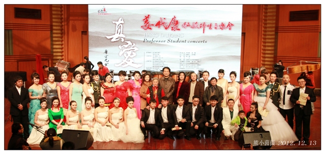 音乐会贯穿了“真爱”的主题。“真爱”也就是人间大爱,人间真情。亲人之间的爱,师生之间的情,对祖国的爱,对人民的爱,对生活的爱,对艺术的爱,对中国音乐、中国声乐的爱,都是歌者们抒发的情感,讴歌的对象。30年前,姜代康作为著名男高音歌唱家,演唱了《船工号子》等一批“川味”浓郁的创作歌曲,被誉为“中国声乐学派巴蜀风格”代表人物之一。在这次音乐会上,他演唱了咏叹友情的《阳关三叠》和抒发平民百姓“家国情怀”的《故乡》。前者是唐朝诗人王维名作的“古琴”风格交响版;后者是从抗战初期就流行至今的艺术歌曲。在日本军国主义分子掀起“钓鱼岛风波”的今天,选唱此歌,显然别有深意在心头。正如著名诗人艾青诗句所言:“为什么我的眼里常含泪水,因为我对这土地爱得深沉。”人称“老牌唱将”的姜代康,成熟老练、声情并茂,艺术处理精到独特,专家赞其两首歌的演唱已臻“百炼钢化绕指柔”之境界。