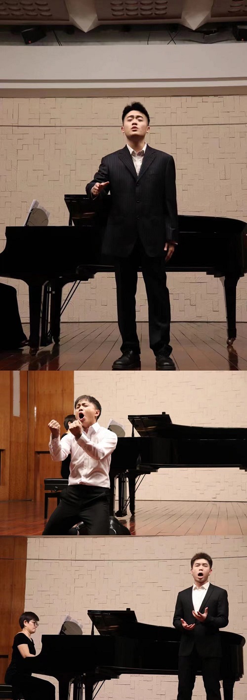 “在路上——音乐会”上全体同学声情并茂的演唱了自己单人曲目,无论是中文、韩文,意大利文,咏叹调等,都完美展现出了自己对歌曲理解。获得了观众以及老师们的一致好评。 音乐会上,每人演唱2到3首不同风格的曲目。每位同学都有自己独唱以及二重唱,不仅仅在于展示学生们对不同音乐风格学习的掌握,还体现了同学之间的配合。