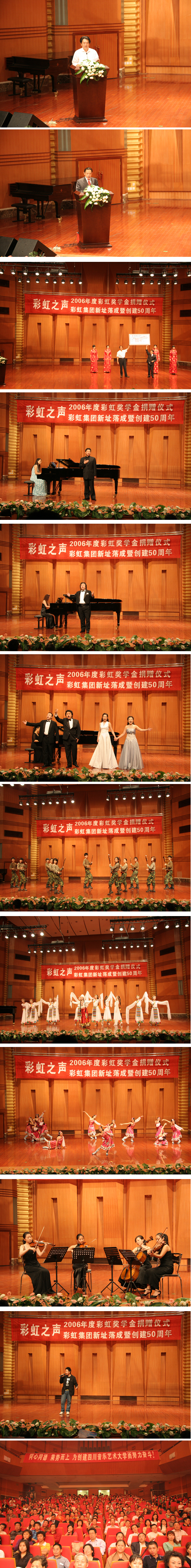 10月22日晚,我院大音乐厅举行了“彩虹之声——2006年度彩虹奖学金捐赠仪式、彩虹集团新址落成暨创建五十周年”音乐会。我院院长敖昌群、副院长李西林出席了捐赠仪式及音乐会。彩虹集团领导和职工代表及我院师生观看了音乐会。 敖院长首先代表伟德bv国际体育向彩虹集团创建50周年表示了衷心的祝贺。彩虹集团在我院声乐二系设立“彩虹奖学金”是回馈社会、支持艺术教育、支持伟德bv国际体育发展的善举,值得我们尊敬和赞扬。 随后,彩虹集团总经理刘荣富将2006年度“彩虹奖学金”奖金十万元捐赠给了声乐二系。接下来的文艺演出节目内容丰富,形式多样,舞蹈、独唱、器乐演奏、女声表演唱等精彩的节目获得了在场观众一阵又一阵热烈的掌声。
