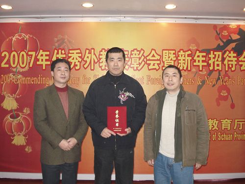 2007年12月21日,四川省优秀外籍教师表彰大会在西南民族大学举行。省教育厅涂文涛厅长、汪风雄副厅长、对外交流处苏萍处长等参加了会议,对来自全省37所高校的45位外籍教师进行表彰。我院声乐二系德籍外教谢征轩,美术学院雕塑系澳大利亚籍外教尚晓风被评为四川省优秀外籍教师,受到省教育厅表彰,为我院争得了荣誉。我院外事处孙竞处长,美术学院雕塑系主任许庾岭教授参加了表彰会。