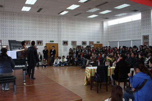 2008年11月24日----11月27日,世界著名的旅美女中音歌唱家杨光到我系讲学,我系师生参加了讲座 。 歌唱家杨光对我系部分中青年老师及学生的演唱进行了精心的指导,特别针对声乐专业方面的技能技巧、歌曲的语言、风格等相关的专业知识进行了有的放矢的讲解。在整个讲座的过程中,师生们对歌唱家杨光的精彩教学不时报以热烈的掌声。 通过这次的讲座,使在场的每位师生拓宽了视野,吸取了一些新的声乐专业理念。