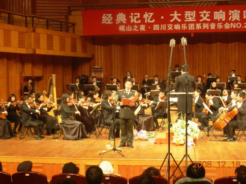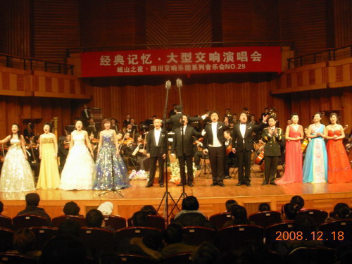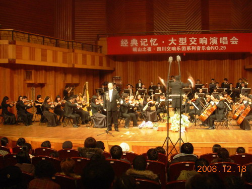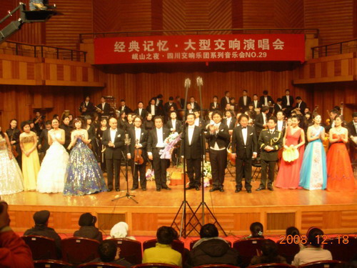 2008年12月18日晚,我系18位中青年教师与四川交响乐团合作的大型交响演唱会在成都市娇子音乐厅隆重上演,学院各部门有关负责人、我院师生和部分其它高校声乐专业的师生及社会声乐爱好者共800多人观看了演出。 音乐会在我系青年教师何捷的<<柴可夫斯基降B小调第一钢琴协奏曲>>中拉开了序幕。而在本场音乐会中,我系教师演唱了大量的国内外经典名曲,如: <<我爱你,中华>>、<<把一切献给党>>、<<晴朗的一天>>、<<今夜无人入睡>>等一些脍炙人口的歌曲。他们精彩的演唱使台下的观众掌声经久不息、观众热情高涨、使音乐会达到了一个又一个的高潮。最后音乐会在全体演员演唱<<饮酒歌>>的歌声中结束。 此次音乐会是艺术高校与省职业交响乐团合作的一次实践,可谓是强强联手,音乐会不仅给各位观众朋友们带来了高雅而精彩的艺术享受,而且还将会对我省声乐事业的普及与提高起到有益的促进作用。