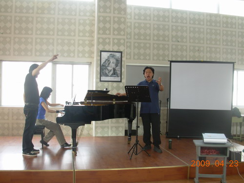 2009年4月19日—24日, 毕业于中央音乐学院声歌系,世界著名男低音歌唱家,青岛大学声乐系主任王景彬教授受邀到我院讲学。举办了关于意大利美声唱法的专题学术讲座。并为十余名青年教师及学生举办了为期一周的声乐大师课。王景彬教授耐心细致、一丝不苟的严谨治学态度,给每一位师生留下了深刻的印象。在教学中,他对意大利美声唱法发声技术的精妙解释、对歌剧咏叹调的人物特征的准确把握、对意大利古典艺术歌曲的演唱风格的深入阐释和对意大利语歌唱发音的精准要求,都使上课的青年教师和学生们受益非浅,大大地提升了大家对意大利美声唱法的再认识。 在整个讲座的过程中,师生们对歌唱家王景彬教授的精彩教学不时报以热烈的掌声。