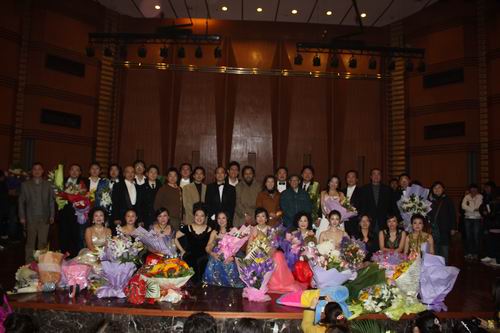2009年12月10日晚,声乐二系一年一度的教师音乐会(之五)——美声专场在学院大音乐厅隆重举行。学院党委副书记、纪委书记文云英和各有关部门负责人、我院师生和部分其它高校声乐专业的师生及社会声乐爱好者共700多人观看了演出,整场音乐会座无虚席。 本场音乐会汇集了声乐二系的所有中青年教师及特聘专家、他们演唱了国内外经典名曲,如《我像一朵雪花天上来》、《安慰我的百姓》、《请别忘了我》等一些脍炙人口的歌曲.音乐会以独唱、小合唱、重唱等多种形式为在场的观众献上了一场美妙绝伦的视听盛宴。 音乐会首先以女生小合唱《思乡》《天路》两首曲目拉开了序幕。在本场音乐会中,各位老师以多年积累的丰富教学、演唱经验以及对声乐作品精细的理解从而使演唱更加精彩,使台下的掌声经久不息、观众热情高涨、使音乐会一次又一次的达到了高潮。最后音乐会在全体演员演唱《祖国,我为你干杯》的歌声中结束。 自2005年来,声乐二系教师音乐会已连续成功举行了五年,每次的演出都会出现门票供不应求的局面, 每次的演出都是哪么让观众陶醉。 另外,民族专场将于2009年12月17日晚在学院大音乐厅上演。