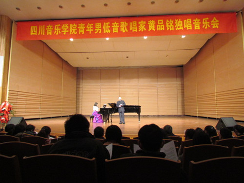 2011年12月7日晚,我系教师黄品铭归国首场独唱音乐会在坐落于美丽的西子湖畔的杭州音乐厅成功举行,音乐会现场气氛热烈高潮迭起,杭师大音乐学院的有关领导专家及当地同行均给予高度评价,都认为这是一场非常难得的高水平的音乐会,给大家带来了一场丰盛的男低音独唱盛宴。 本次音乐会之前,系主任江向东教授仔细观看了黄老师的全场排练,对每一个节目都做了点评和提出指导意见,并勉励黄老师和伴奏:要唱出川音精神,努力展现出我们学校的良好形象。本次音乐会的钢琴伴奏由钢琴系的研究生赵凤飞担任。 音乐会的成功举办也得到了杭州师范大学音乐学院领导的高度重视和大力支持。