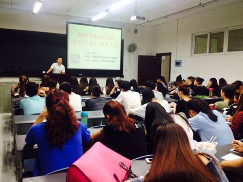 9月15日上午,舞蹈学院在一教学楼106教室召开了2015届毕业生就业动员大会。2015届全体毕业生参加了此次大会。 会上,李戈老师做了毕业动员。李老师以2014届毕业生就业情况为例,明确毕业生“毕业”身份、排除“迷茫、胆怯、懈怠”就业心理,要求同学们做好“积极、自信”的心理准备;分析目前就业形势,告诉学生获取就业信息的途径,指导学生如何制作自荐书、专业准备、面试技巧。要求2015届毕业生认真对待就业,认真准备应聘的材料、专业技能,积极应聘,特别强调在应聘的过程中要注意安全、讲究礼仪。